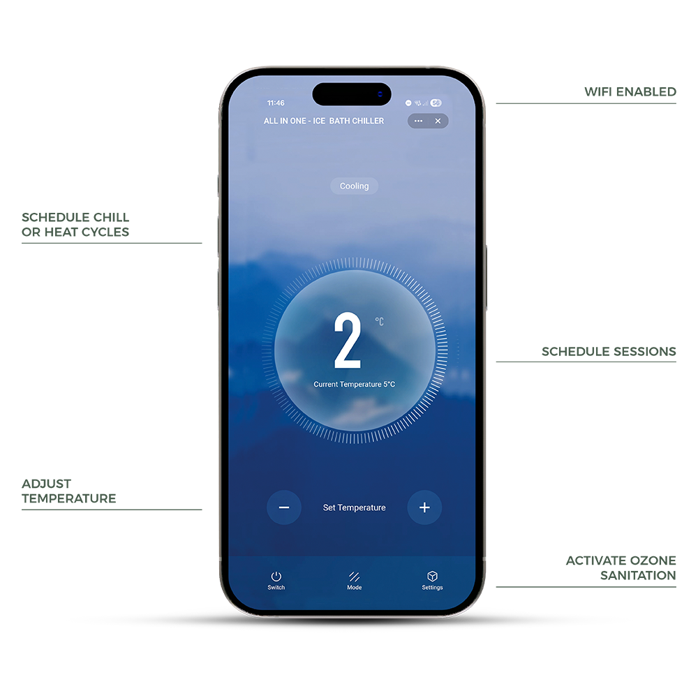 Forget the plumbing drama. The Glasur’s all-in-one design eliminates the need for hose connections or external chillers, just fill the tub and flick it on. It cools down to an invigorating 2°C or warms up to a toasty 40°C, giving you complete temperature control for cold plunges or hot soaks, all without complex setups. This makes it a perfect solution for busy households or wellness studios where convenience matters.