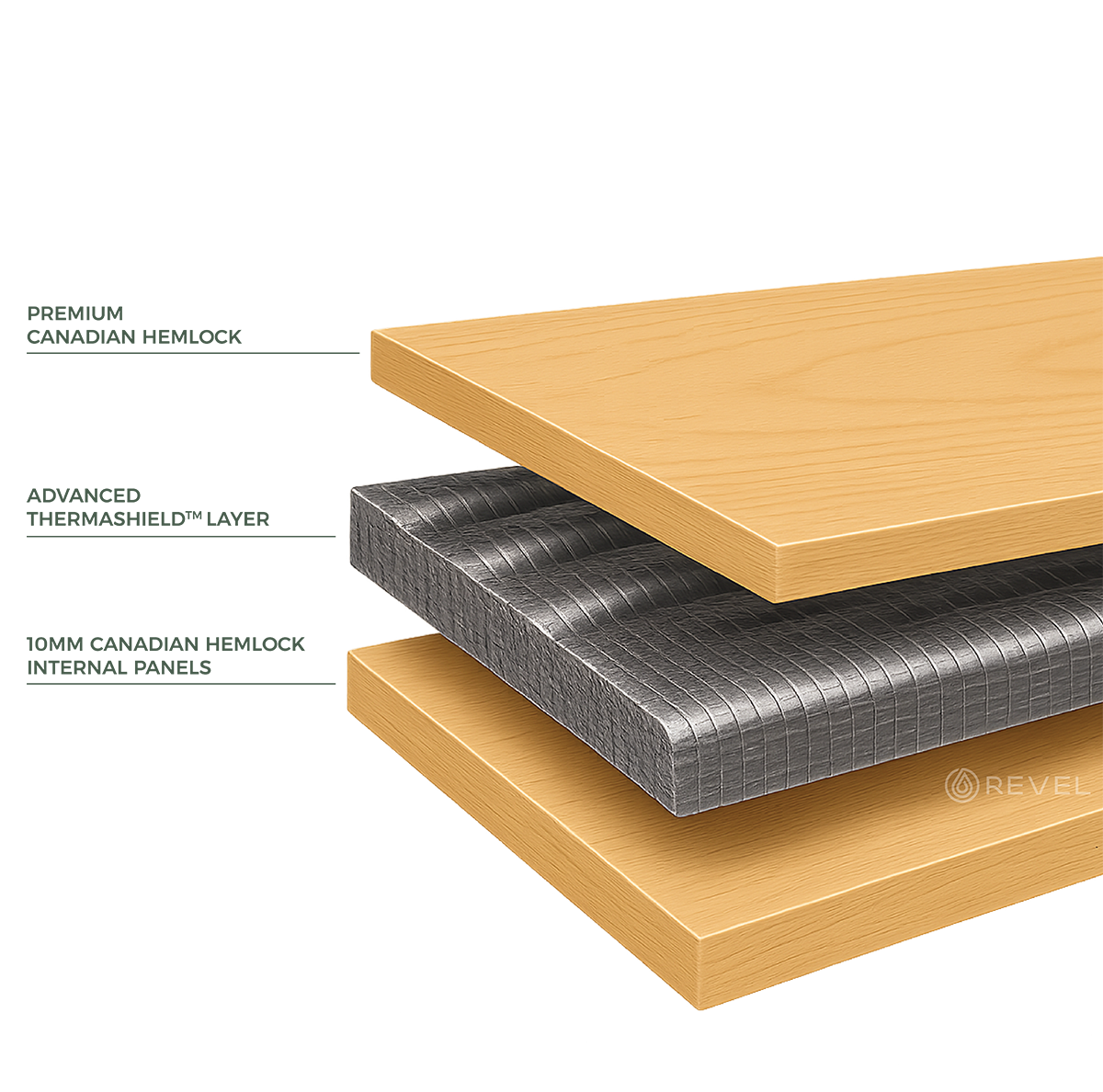 Built with premium Canadian Hemlock, known for its durability, calming aroma, and elegant finish, every Revel Tampere sauna features our advanced ThermaShield Wall System. Inside, a thick 15 millimeter insulation core is paired with 10 millimeter internal timber panels, offering double the wall thickness found in most saunas on the market. This multi-layered design maximizes heat retention, improves energy efficiency, and creates a stable, enveloping warmth that enhances every session.