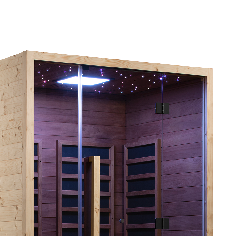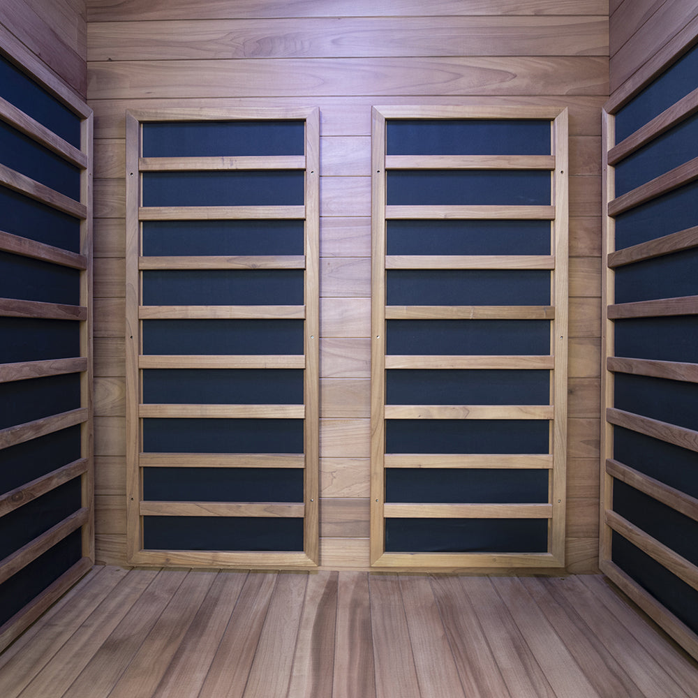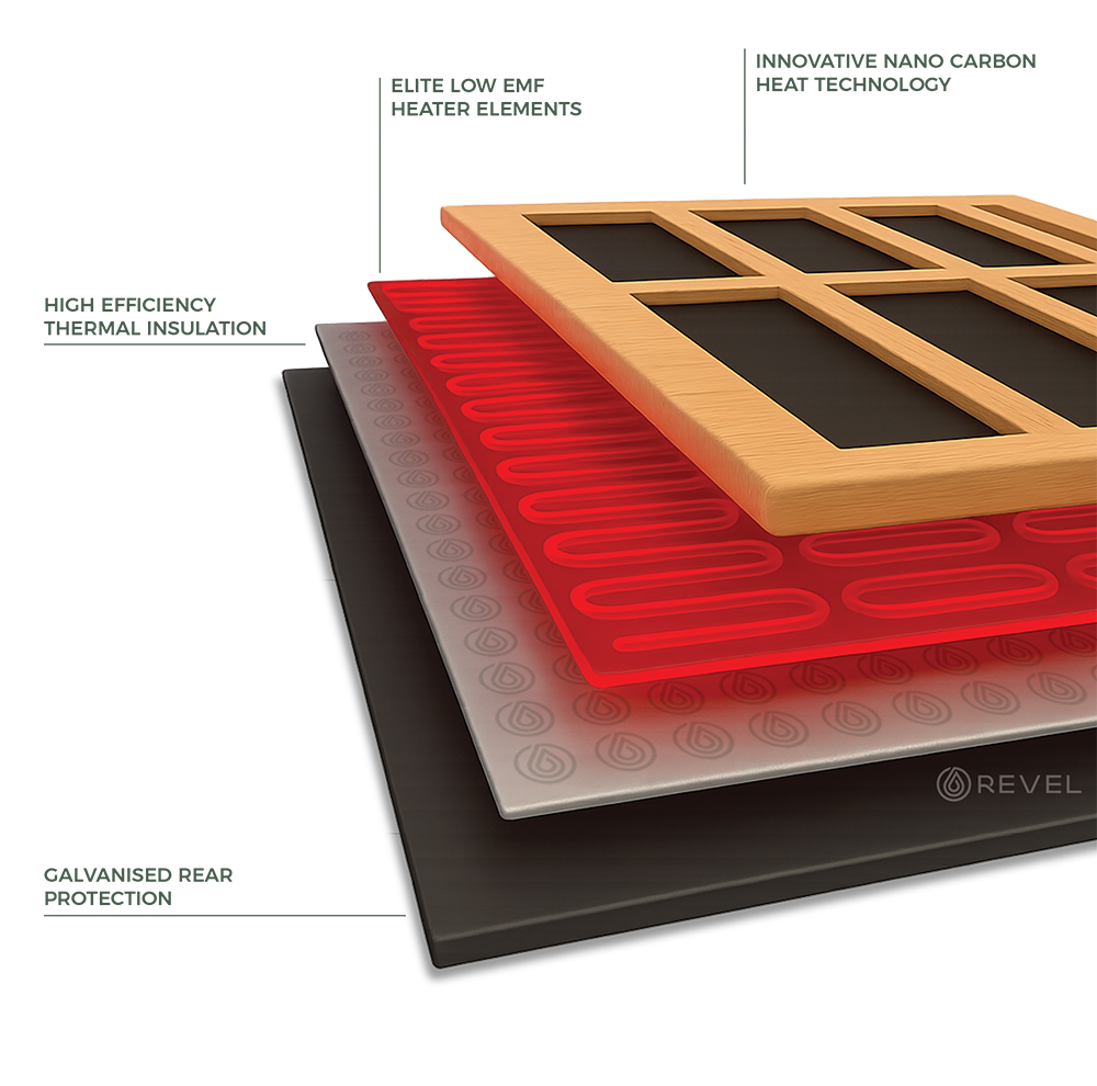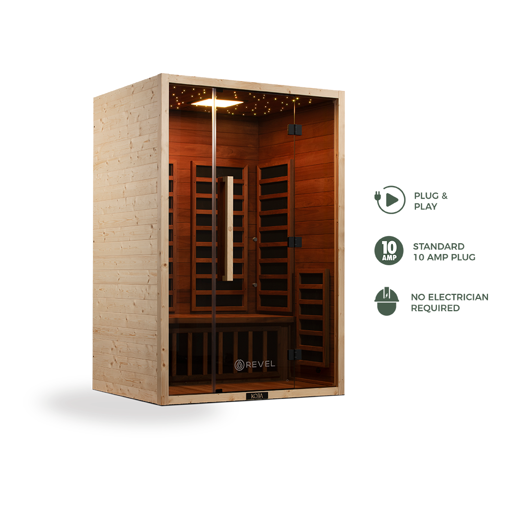 The Kora is powered by 7 low EMF carbon infrared heaters, designed to create a smooth, consistent heat profile throughout the entire cabin. That means a comfortable, all-encompassing warmth that feels balanced and natural, no harsh spikes, no chilly corners, just a steady, immersive sauna experience that allows you to fully switch off and settle in.