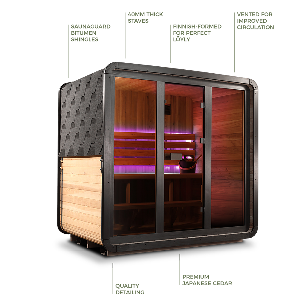 The Virta is meticulously engineered with 40mm thick rustic cedar staves for exceptional heat retention and structural integrity. Its square cabin shape isn’t just a design choice, it’s a functional one, providing a generous flat ceiling area above the top bench where heat and steam naturally collect. This aligns with traditional Finnish design standards, which prioritise ceiling height and the bench-to-ceiling gap for optimal löyly. Every panel is carefully crafted for a snug, precise fit that ensures maximum durability and energy efficiency. Whether you're firing it up daily or just a few times a week, this sauna is built to last, giving you years of restorative wellness without compromise. With its commanding presence and resilient build, the Virta doesn’t just complement your space, it’s made to thrive in it, season after season.