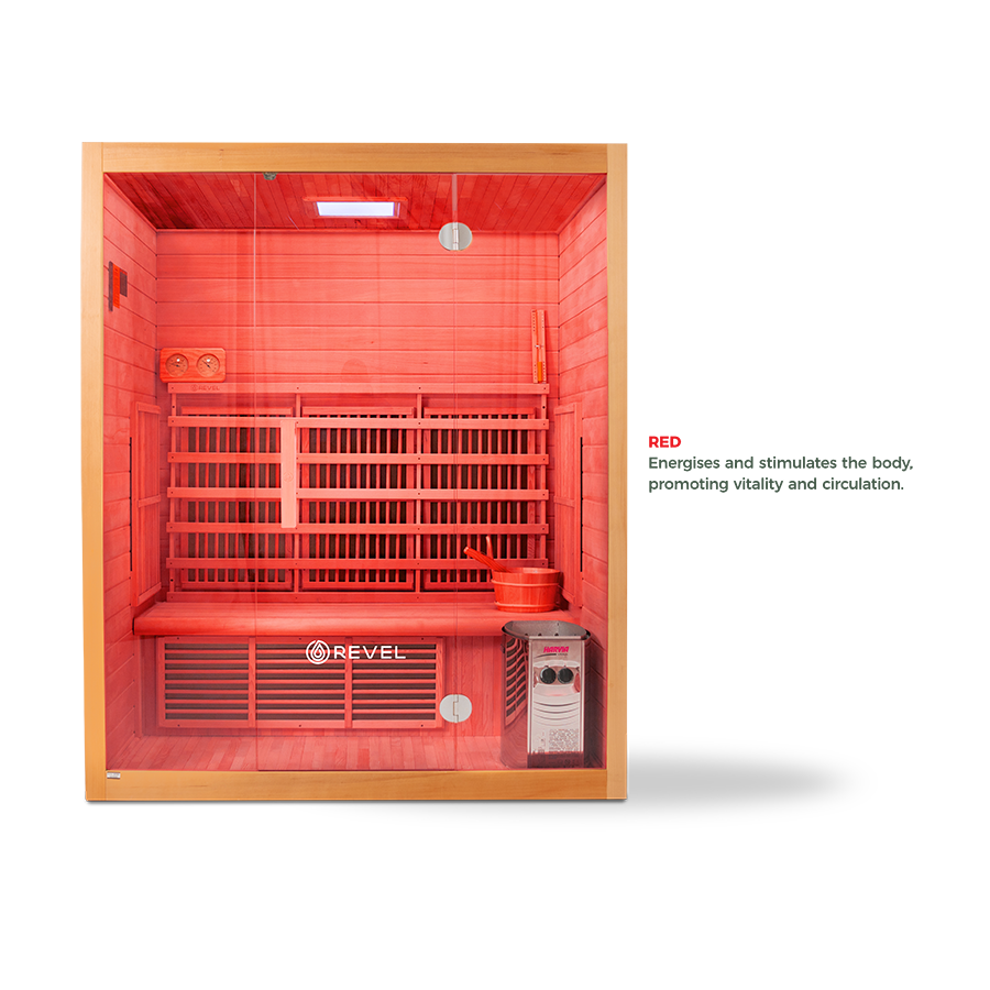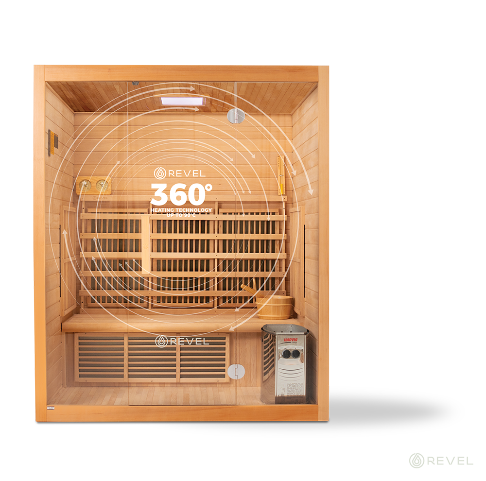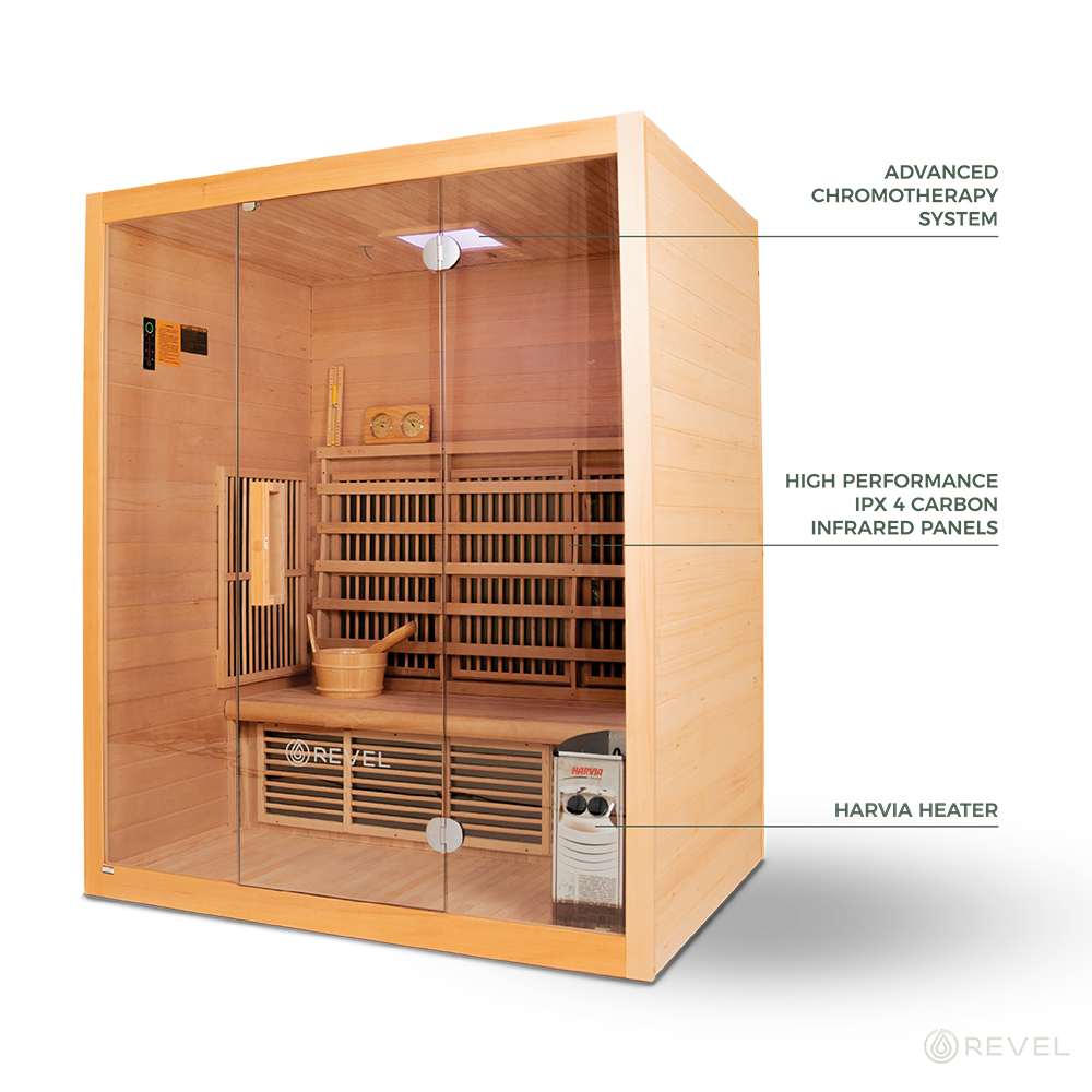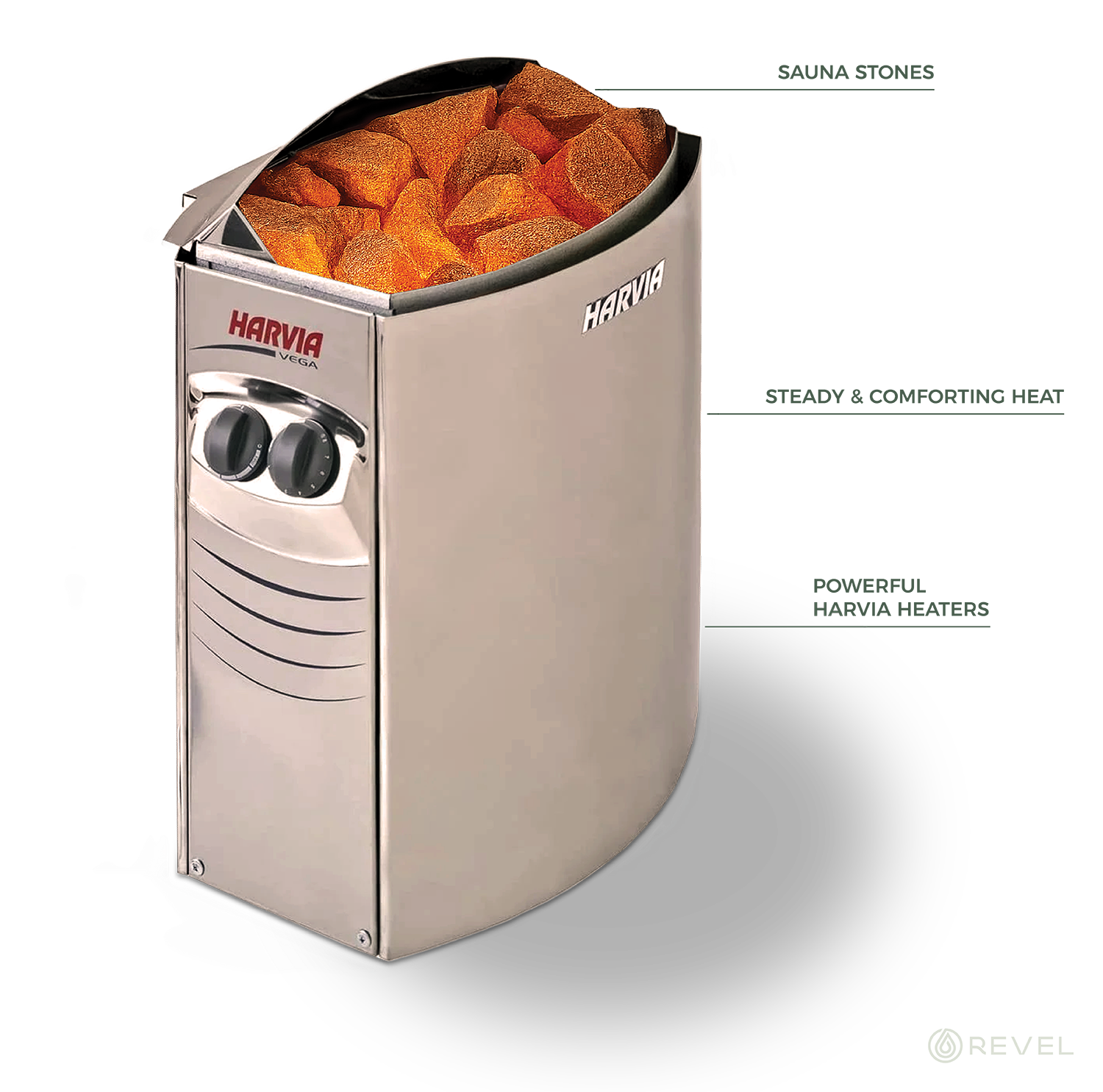 The Revel NordicWave blends the best of both worlds with traditional Finnish heat from a Harvia heater and far infrared warmth from carbon panel technology. The Harvia unit heats sauna stones to deliver rich, soft steam, while the infrared panels offer a quick, dry heat that targets deep tissue recovery and detoxification. These systems are designed to be used separately, giving you the freedom to choose the style of heat that best suits your wellness goals.