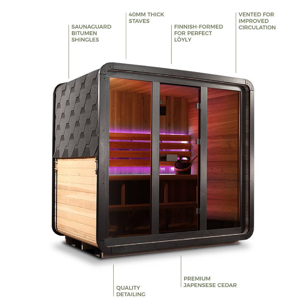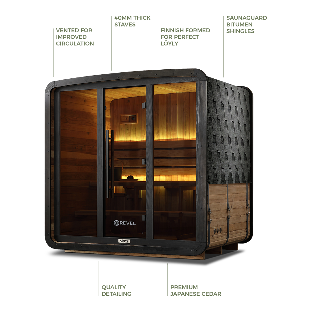 The Virta is meticulously engineered with 40mm thick rustic cedar staves for exceptional heat retention and structural integrity. Its square cabin shape isn’t just a design choice, it’s a functional one, providing a generous flat ceiling area above the top bench where heat and steam naturally collect. This aligns with traditional Finnish design standards, which prioritise ceiling height and the bench-to-ceiling gap for optimal löyly. Every panel is carefully crafted for a snug, precise fit that ensures maximum durability and energy efficiency. Whether you're firing it up daily or just a few times a week, this sauna is built to last, giving you years of restorative wellness without compromise. With its commanding presence and resilient build, the Virta doesn’t just complement your space, it’s made to thrive in it, season after season.