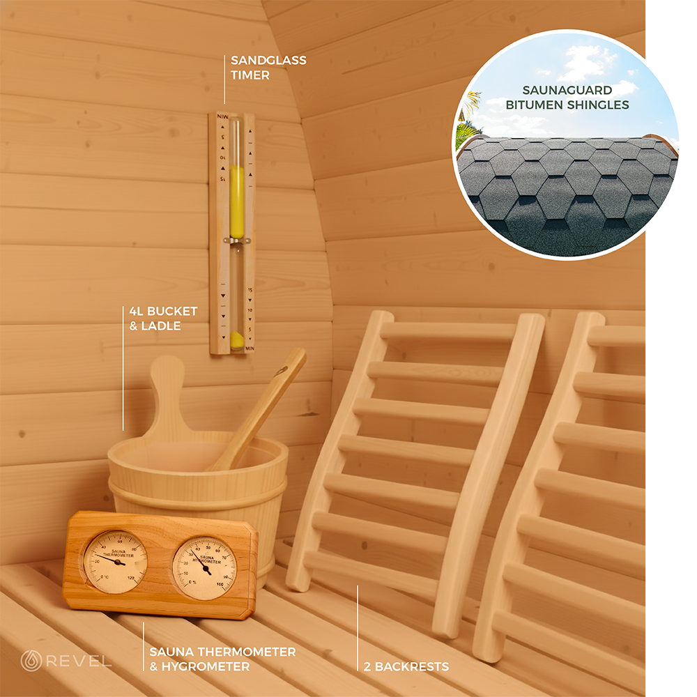 The Eden Barrel comes fully equipped with a carefully selected accessory kit to complete your sauna ritual. Each unit includes a timber bucket and ladle, and a hygro-thermometer for tracking temperature and humidity, and a sandglass timer enabling you to optimise your sauna time.